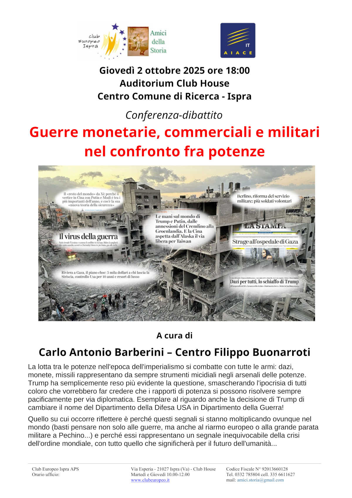 Riceviamo e volentieri divulghiamo: Giovedì 2 ottobre 2025 Club House CCR - Ispra Ore 18:00 Gli Amici della Storia - Club Europeo organizzano la conferenza-dibattito: Guerre monetarie, commerciali e militari nel confronto fra potenze