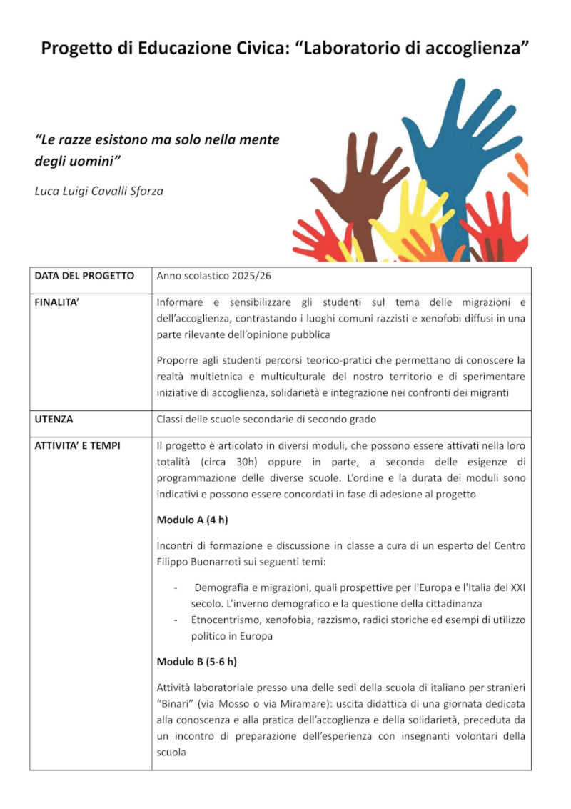 | 18/10/2023: ll Coordinamento insegnanti contro razzismo, xenofobia e nazionalismo | Il Centro Filippo Buonarroti è impegnato fin dalle origini ad offrire ai colleghi strumenti utili a raggiungere l’obiettivo di una efficace azione contro il razzismo e le altre ideologie connesse. Ricordiamo tra gli altri strumenti le conferenze per classi o gruppi di classi, i gruppi di studio, i corsi di formazione per insegnanti, le iniziative di PCTO (percorsi per le competenze trasversali e per l’orientamento), ecc. MERCOLEDI' 18 OTTOBRE TERZO INCONTRO DEL COORDINAMENTO Sede Centro Filippo Buonarroti- via Rovigno 26 m1 Turro E' PRONTO E DISPONIBILE A RICHIESTA IL PROGETTO "LABORATORIO DI ACCOGLIENZA"